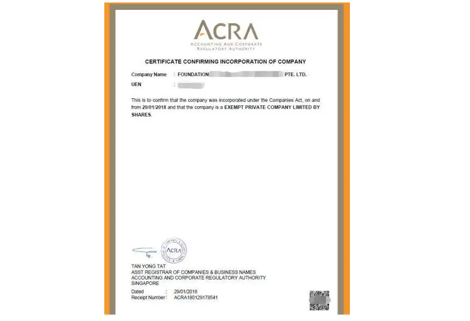 5.新加坡會計和商業登記局簽發并接收公司登記證。同時,提交其他登記文件。